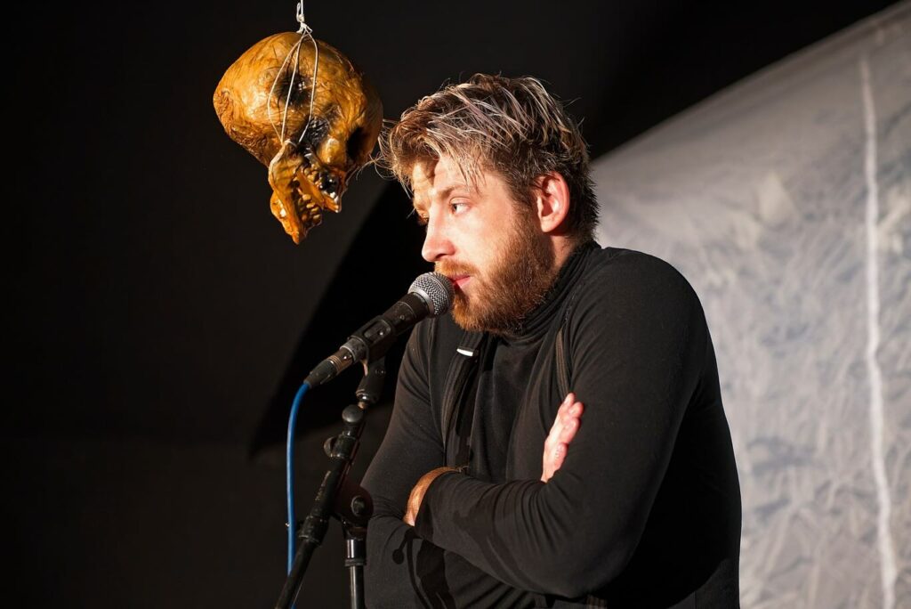 Výkonu Jana Janči v ústřední a jediné roli se přitom nedá nic vytknout, existuje na jevišti zcela přirozeně, bez přílišného patosu či exhibování, k nimž mají herci vystupující v monodramatech někdy tendenci sklouzávat. Žádné „hleďte, já hraju“, ale spíše „ve vší skromnosti na sebe beru danou postavu“. Dočetla jsem se, že Janča studoval metodické herectví na The Lee Strasberg Theatre and Film Institute v New Yorku, přičemž tato herecká škola si zakládá na umu úplně splynout s postavou, a toho jsme v Dies Irae svědky. Žádné u nás tak oblíbené zcizovací efekty, více či méně znatelný odstup herce od postavy. Přesto jsem si paradoxně nejvíce užívala momenty, které vybočovaly z Jančova jinak disciplinovaně realistického projevu a staly se nositeli oněch symbolických kvalit inscenace. Především šlo o divoký tanec protagonisty na píseň Ça plane pour moi či o scény, v nichž pomocí lebek a modulace hlasu předváděl ostatní postavy, jmenovitě mužovu matku a protivného souseda-dezoláta. Jinak se však inscenace nesla spíše na stereotypní vlně výrazově umírněné, byť autenticky vyznívající terapeutické zpovědi.