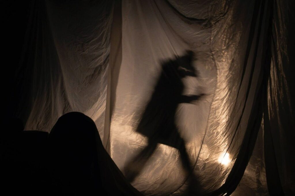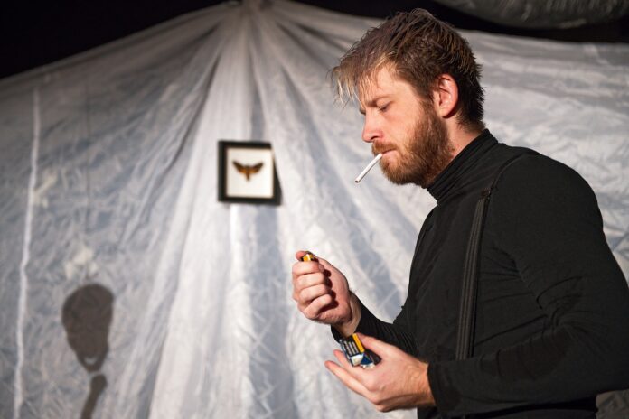 Problematická je především zastřešující situace terapeutického sezení, nastolená na začátku, jejíž realismus ovšem v průběhu představení stále více naráží na symbolické kvality scénického řešení. Hrdina přichází do abstraktního prostoru s pár kusy nábytku překrytými bílou plachtou (ta tvoří i zadní průsvitný horizont, za nímž se rovněž místy hraje), myje si ruce v lavoru na zemi a obrací se k publiku, jako by bylo jakýmsi kolektivním psychologem. Verbálně nás provokuje, abychom mu položili nějakou otázku, ale z projevu Jana Janči je jasné, že tvůrčí tým o diváckou aktivitu nestojí, nepočítá s ní. Tedy dále mlčíme a necháváme protagonistu, aby se vypovídal. Ovšem pocit falše nastolené situace přetrvává. Několik symbolických předmětů a akcí – lišaj smrtihlav zavěšený v rámečku vzadu na „stěně“ z plachty, očista rukou a tváře, přítomnost dvou lidských lebek na scéně – lehce, ale nikoli zcela průkazně sugeruje, že se protagonista nachází v jakési přestupní stanici mezi životem a smrtí à la Sartrovo S vyloučením veřejnosti. Kdo jsou pak diváci? Ostatní čekatelé na poslední soud? Božská autorita? Až do konce produkce jsem se nezbavila pocitu, že tvůrci mě v tomto ohledu nechávají až příliš tápat.